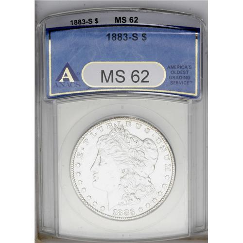 <B>1883-S<img border='0' src='http://www.heritagecoins.com/images/star.gif' width=10 height=10>$1> MS62 ANACS.</B></I> A well struck representative of this conditionally scarce issue. Lightly toned, and marks are relatively minor for the grade. <BR><BR><B>Important notice:</B> Heritage usually auctions material at the rate of 200-250 lots per hour. On some occasions eBay Live bid software or the Internet may not be able to keep up with the pace of the auction. We recommend placing a realistic absentee bid now as insurance to avoid disappointment. Occasionally the auctioneer may eliminate or reject an eBay Live bid, and the auctioneer may also reopen a lot after the close of the eBay live bidding (usually because we missed an audience bid), and may reject your bid even if it shows you as the winning bidder. By bidding via eBay Live, you agree that Heritage may award the lot to another bidder at its sole discretion under the circumstances described above or any other reasonable circumstances. Since eBay bids are not shown to us until we open the lot on the floor, we treat those bids just like floor bids. In most cases the floor responds before the eBay bid is presented to us, due to Internet lag time, so for consistency we have made it a policy that floor bids are always considered first over tie eBay live bids. Also please note that all Heritage lots purchased through eBay Live carry a 20% Buyer's Premium. Please make sure you read the Terms and Conditions before you bid. This lot is being auctioned in conjunction with a live floor auction by Heritage Galleries & Auctioneers. All final auction and invoice information will be supplied by Heritage Galleries & Auctioneers, and all other information should be considered preliminary. Lot:3380 <BR><BR><B>Winning Notification and Billing:</B> After the FINAL session in this auction is complete, Heritage will send e-mail and snail mail invoices. This process normally takes several days. All final auction and invoice information will be supplied by Heritage Galleries & Auctioneers, and all other information should be considered preliminary. <BR><BR>This auction will be conducted on a live auction floor and over the Internet through eBay Live. If you choose to place an absentee bid, please take a moment to <font color='#0000ff'><u><a href='http://pages.ebay.com/liveauctions/help/before/laabsentee.html'>learn how eBay Live absentee bidding works</a></u></font><font color='#000000'>