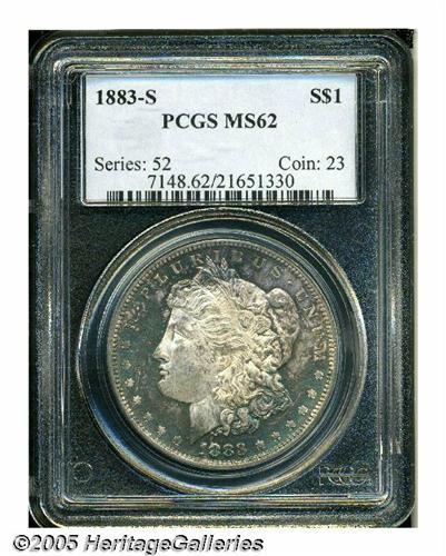 <B>1883-S<S$1> MS62 PCGS.</B></I> A fully lustrous and nicely struck example of this conditionally difficult S-mint Dollar. Deep forest-green patina dominates the abraded obverse field. The reverse, in contrast, is lightly toned in rose hues.