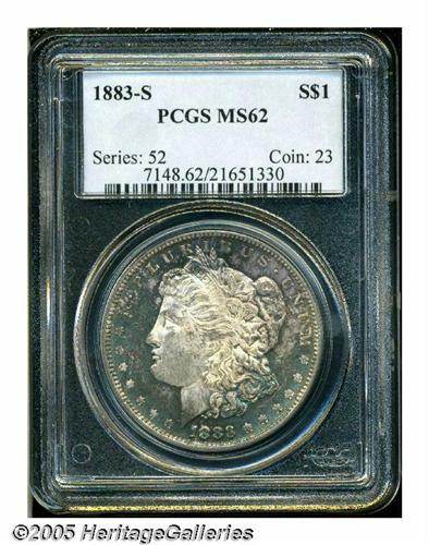 <B>1883-S<S$1> MS62 PCGS.</B></I> A fully lustrous and nicely struck example of this conditionally difficult S-mint Dollar. Deep forest-green patina dominates the abraded obverse field. The reverse, in contrast, is lightly toned in rose hues.