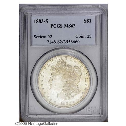 1883-S S$1 MS62 PCGS. Light golden patina is noted on 1883-S[S$1] MS62 PCGS.