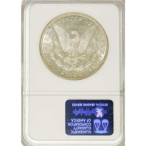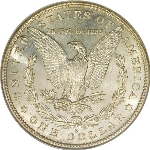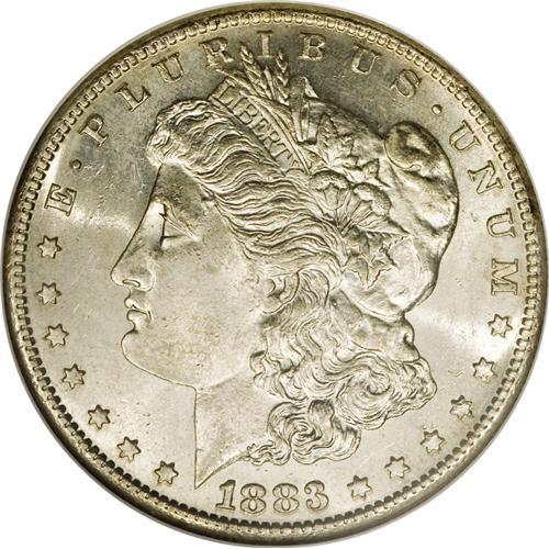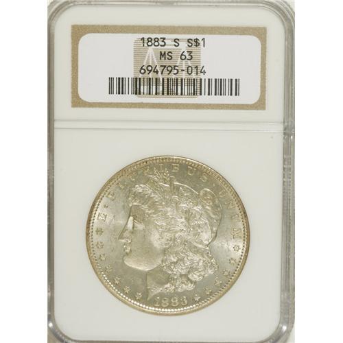 <B>1883-S S$1 MS63 NGC.</B></I> A few dapples of light gray gravitate to the borders of this Select S-mint dollar. The luster is pleasing, and the design elements exhibit the usually-seen sharp definition, including good detail in the hair around Liberty's ear. While bagmarks are usually a significant problem on this issue, the handful of obverse marks on this example just barely preclude near-Gem status.<BR><BR><b>Shipping:</b> Coins & Currency (<a target="_blank" href="http://www.heritageauctions.com/common/shipping.php">view shipping information</a>)