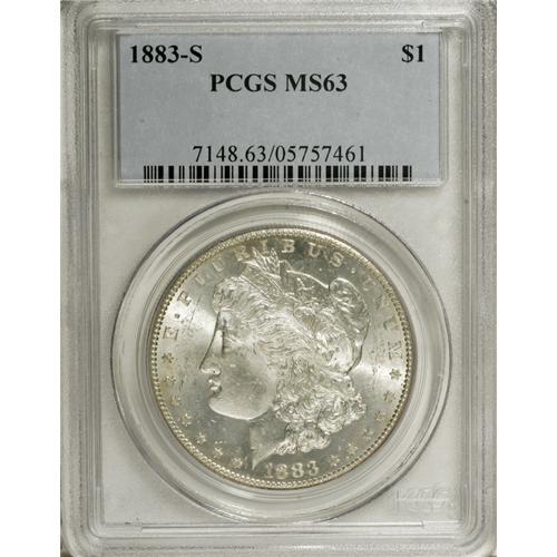<B>1883-S S$1 MS63 PCGS.</B></I> David Bowers (1993) notes that the 1883-S Morgan dollar "... is very scarce in lower Mint State levels. Probably about 10,000 to 20,000 are on the face of the earth, some of which may really be in the AU or 'slider' category." This Select Uncirculated specimen displays coruscating luster, and just a wisp of light color at the margins. Its design features reveal strong impressions, including good definition in the hair over Liberty's ear and on the eagle's breast feathers. The reverse is impeccably preserved, while a few minor obverse luster grazes prevent a higher grade.<BR><BR><b>Shipping:</b> Coins & Currency (<a target="_blank" href="http://www.heritageauctions.com/common/shipping.php">view shipping information</a>)