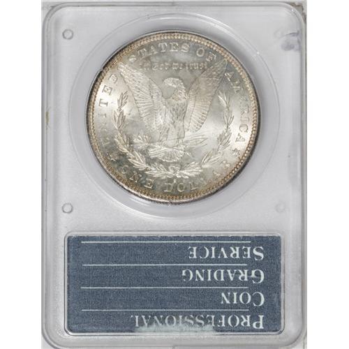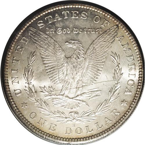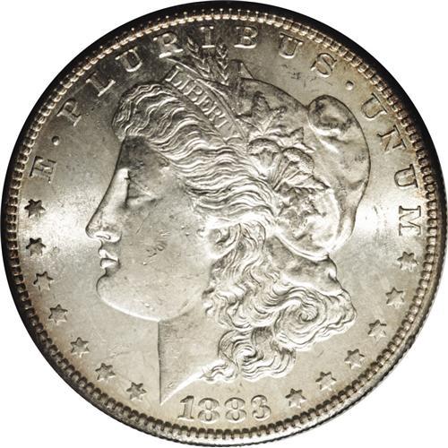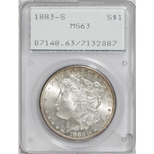 <B>1883-S<img border='0' src='http://www.heritagecoins.com/images/star.gif' width=10 height=10>$1> MS63 PCGS.</B></I> Great luster with hints of champagne toning at the periphery. Nicely struck, especially for this issue, and the fields are remarkably clean for the grade. Two small luster scrapes on Liberty's cheek are clearly meant to account for the grade. Housed in an early holder.