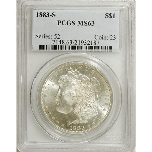 <B>1883-S S$1 MS63 PCGS.</B></I> The 1883-S carries semi-key status in the Morgan dollar series. David Bowers (2004) writes of this issue that: " ... the 1883-S is very difficult to find, especially at higher Mint State levels. Among 1883-S dollars, bagmarks are a significant problem. These must have been stored and handled roughly." Potent luster exudes from the untoned surfaces of the MS63 coin in the present lot. Relatively well struck, with partial definition in the hair at Liberty's ear and the eagle's breast feathers. A few light marks, while grade-defining, are not that disturbing.<BR><BR><b>Shipping:</b> Coins & Currency (<a target="_blank" href="http://www.heritageauctions.com/common/shipping.php">view shipping information</a>)