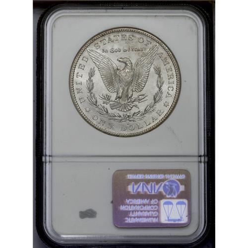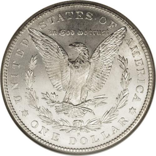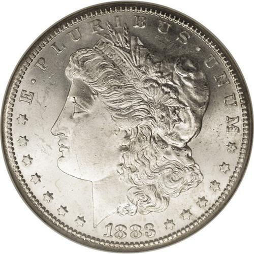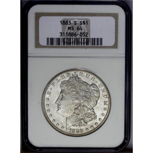 <B>1883-S<img border='0' src='http://www.heritagecoins.com/images/star.gif' width=10 height=10>$1> MS64 NGC.</B></I> The 1882-S and 1883-S dollars have comparable mintages, but while the 1882-S is common in Mint State, the 1883-S is scarce in AU and rare in better Uncirculated grades. This brilliant and fully lustrous near-Gem has superior eye appeal for the issue, and perhaps is limited in grade only by slight striking softness in the centers.