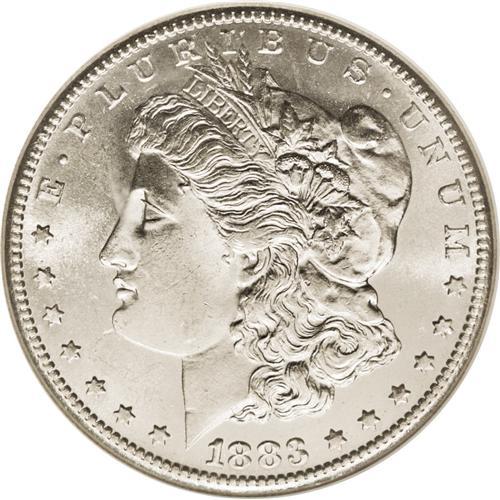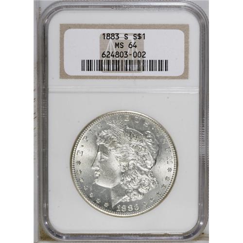 <B>1883-S<img border='0' src='http://www.heritagecoins.com/images/star.gif' width=10 height=10>$1> MS64 NGC.</B></I> Usually found heavily bagmarked and/or other surface impairments. Lightly abraded specimens such as the present example are in the distinct minority. This piece is brilliant and fairly well struck, revealing only a few light, grade-consistent abrasions and light softness on the hair over the ear. NGC has graded 18 coins finer (9/06).