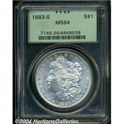 <B>1883-S<S$1> MS64 PCGS.</B></I> Quite a sharp strike with brilliant silver luster and excellent eye appeal. This near-Gem quality coin has frosty surfaces with delicate orange toning. From a mintage of our six million coins, this issue is quite common in all circulated grades, however, becomes scarce when in MS60 or higher quality. Choice and Gem quality specimens, such as the coin we are offering here, are quite rare. <BR><BR><B>Important notice:</B> Heritage usually auctions material at the rate of 200-250 lots per hour. On some occasions eBay Live bid software or the Internet may not be able to keep up with the pace of the auction. We recommend placing a realistic absentee bid now as insurance to avoid disappointment. Occasionally the auctioneer may eliminate or reject an eBay Live bid, and the auctioneer may also reopen a lot after the close of the eBay live bidding (usually because we missed an audience bid), and may reject your bid even if it shows you as the winning bidder. By bidding via eBay Live, you agree that Heritage may award the lot to another bidder at its sole discretion under the circumstances described above or any other reasonable circumstances. Since eBay bids are not shown to us until we open the lot on the floor, we treat those bids just like floor bids. In most cases the floor responds before the eBay bid is presented to us, due to Internet lag time, so for consistency we have made it a policy that floor bids are always considered first over tie eBay live bids. Also please note that all Heritage lots purchased through eBay Live carry a 20% Buyer's Premium. Please make sure you read the Terms and Conditions before you bid. </span></font></tr></table></td></tr></table>