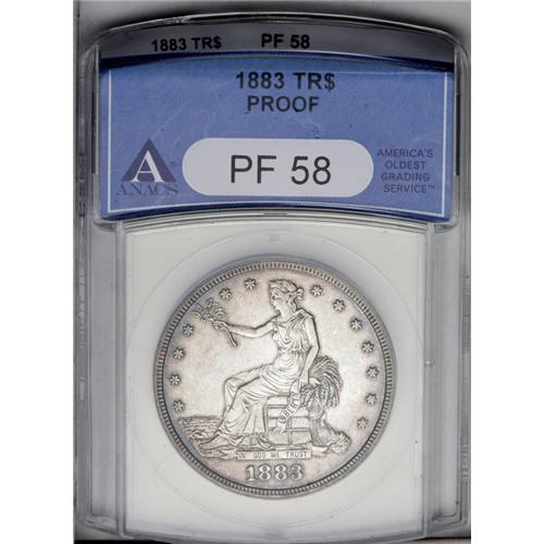 <B>1883<T$1> PR58 ANACS.</B></I> Lightly circulated examples of the proof-only trade dollar coinage are always in demand by collectors who desire such coins but have limited budgets. This example is perfect for the occasion with light gray surfaces. Much of the proof finish remains, although the fields have myriad abrasions. Hints of pale blue toning are noted along the borders.<BR><I>From The Steve Glenn Collection, Part Two.</B></I>