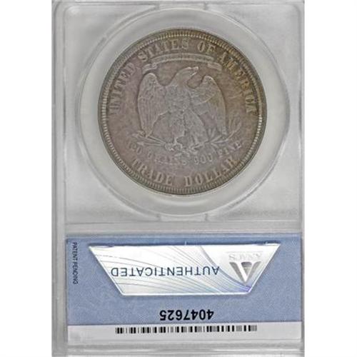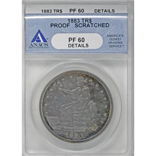 <B>1883 T$1 --Scratched--ANACS. PR60 Details.</B></I> A sharply struck representative from the last of the generally available Trade dollar issues. The lightly hairlined surfaces are toned blue-green, peach, and rose-violet, and a number of light scratches appear in the obverse fields.<BR><I>Ex: ANA Centennial Auction (Bowers and Merena, 8/91), lot 557.<BR>From The John Stimson, Sr. Collection, Part One.</B></I><BR><BR><B>Coin Engraver:</B> William Barber<BR><BR><b>Shipping:</b> Coins & Currency (<a target="_blank" href="http://www.heritageauctions.com/common/shipping.php">view shipping information</a>)
