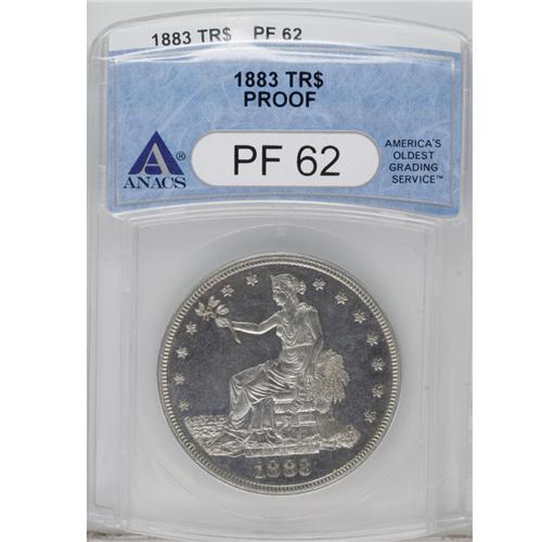 <B>1883 T$1 PR62 ANACS.</B></I> One of only 979 specimens coined for this proof-only issue. Boldly impressed with moderately reflective and somewhat hazy gold-tinged fields that have significant, grade-defining hairlines.<BR><BR><b>Shipping:</b> Coins & Currency (<a target="_blank" href="http://www.heritageauctions.com/common/shipping.php">view shipping information</a>)