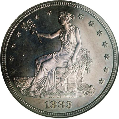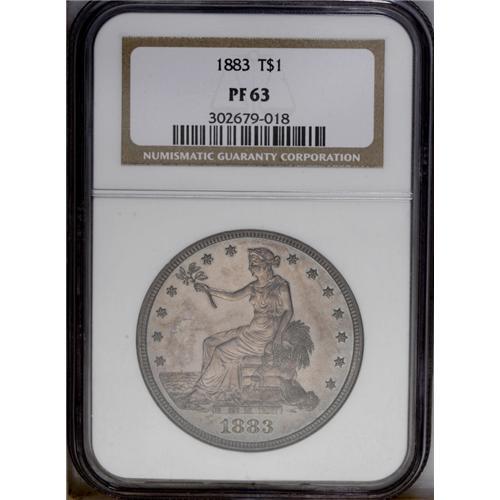 <B>1883<T$1> PR63 NGC.</B></I> A minimally hairlined proof specimen, toned on either side in splashes of deep blue-gray and reddish-rose iridescence. A proof-only and the final collectible date of the series, followed only by the ultra-rare 1884 and 1885 issues.