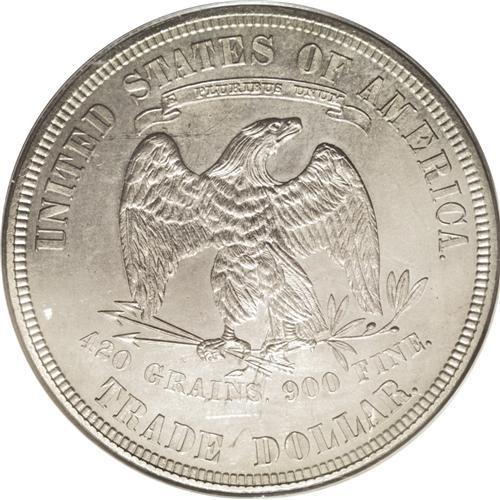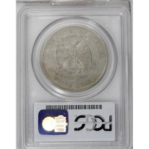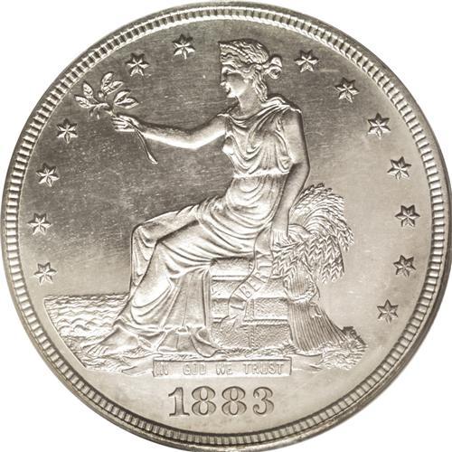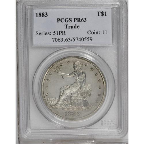 <B>1883<T$1> PR63 PCGS.</B></I> This is the final year of issue for the Trade dollar, save for two clandestine (and extremely expensive) rarities dated 1884 and 1885. Only 979 proofs were struck, and it is not clear if all of those found buyers at the time of issue. It is likely that an unsold remainder were melted at a later date. This example is sharply struck, with nice definition showing on all of the design elements. Liberty's hair and crown are nicely detailed, as are the eagle's feathers. Aside from a few wispy hairlines in the fields, the surfaces are nicely preserved, and are enriched with a layer of steel-gray patination.