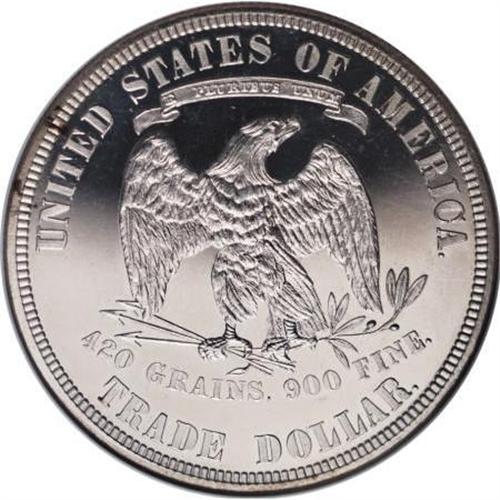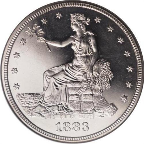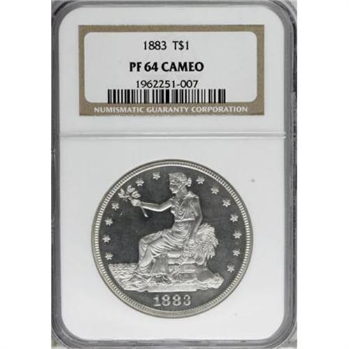 <B>1883 T$1 PR64 Cameo NGC.</B></I> Deeply reflective with heavy contrast, this near-Gem is a representative of the last official Trade dollar issue, as those of 1884 and 1885 were clandestine. The obverse fields gleam beneath just a touch of haze, while two spots of deep amber toning appear on the rim above UNITED on the reverse. The boldly impressed devices offer rich frost, and the overall level of contrast is strong. A few scattered hairlines on either side of Liberty preclude a finer grade. Census: 22 in 64 Cameo, 37 finer (7/07).<BR><BR><b>Shipping:</b> Coins & Currency (<a target="_blank" href="http://www.heritageauctions.com/common/shipping.php">view shipping information</a>\)