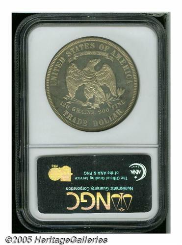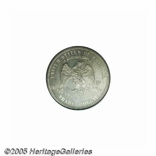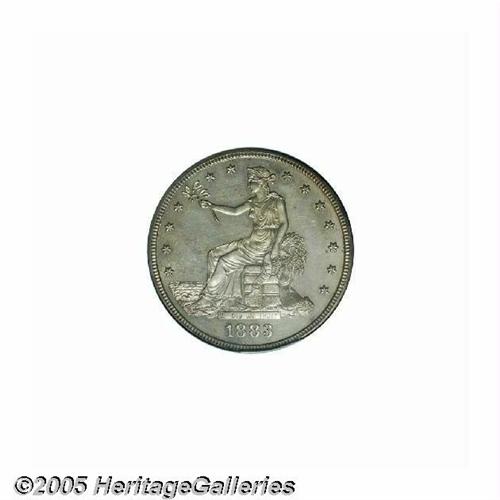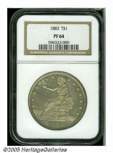 <B>1883<T$1> PR64 NGC.</B></I> With a proof-only mintage of just 979 pieces, the 1883 Trade Dollar is the last collectible issue in this series, as the 1884 and 1885 issues (with just ten pieces and five pieces minted respectively of each) are unobtainable to the average collector. This lovely near-Gem displays slight cameo contrast, with frosted devices and lettering and nicely mirrored fields. A few faint hairlines are visible here and there after close inspection, typical for the assigned grade. Modestly toned, a layer of dove-gray and golden patina lightly blankets each side.