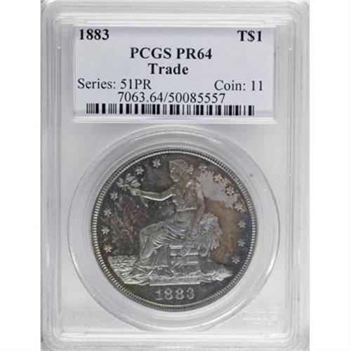 <B>1883 T$1 PR64 PCGS.</B></I> Only 979 pieces were struck of the 1883 proof only Trade dollar, the final year for regular issues in this series. This is a splendid PR64 that is toned in multicolored shadings of sea-green and cobalt-blue on the obverse with a reverse that is gray-lavender with thalo-blue accents around the periphery. Lightly hairlined fields show up under magnification.<BR><BR><B>Coin Engraver:</B> William Barber<BR><BR><b>Shipping:</b> Coins & Currency (<a target="_blank" href="http://www.heritageauctions.com/common/shipping.php">view shipping information</a>\)