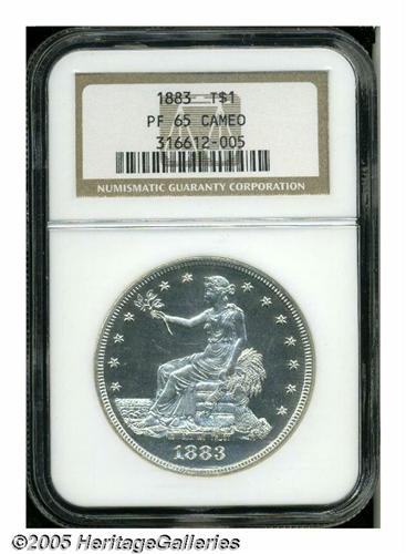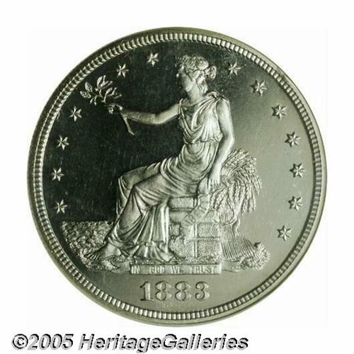<B>1883<T$1> PR65 Cameo NGC.</B></I> The 1883 is a scarce proof-only date with only 979 pieces struck. This is a magnificent example that is brilliant throughout. The fields are deeply mirrored and the devices noticeably frosted, producing a strong cameo contrast on each side. A shimmering, near-flawless Gem proof with exceptional eye appeal. Population: 10 in 65, 19 finer (3/05).