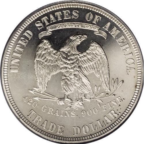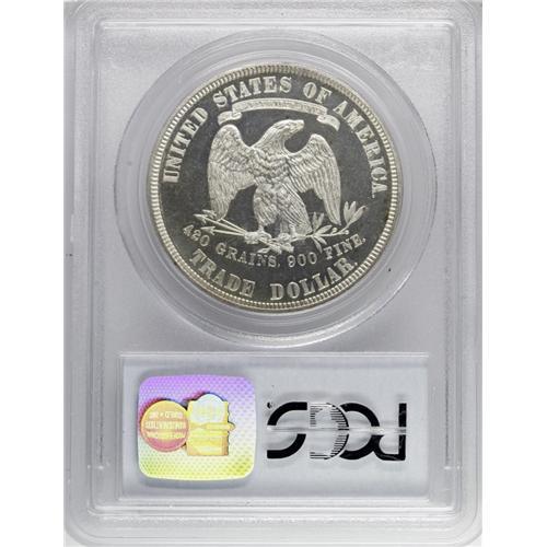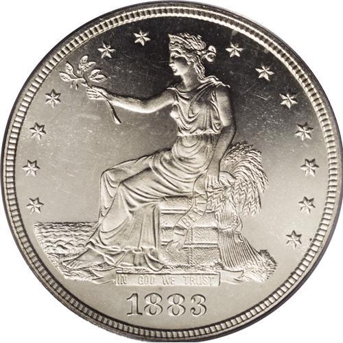 <B>1883 T$1 PR65 Cameo PCGS.</B></I> A splendid Gem that has an unimprovable strike and outstanding white on black cameo contrast. Each side has a hint of gold patina, and a few miniscule freckles of charcoal patina are noted on the reverse. A small planchet flaw (as made) above the R in GRAINS will identify this coin for future catalogers. The bases of the letters in 420 GRAINS are slightly doubled.<BR> A relatively large number of 1883 Trade dollars out of the 979-piece mintage have survived, though Cameo specimens account for a small portion of the total population. About 20 Gems have been assigned the Cameo designation by PCGS and NGC. Population: 12 in 65, 7 finer (10/06).<BR><BR><b>Shipping:</b> Coin/Currency (<a target="_blank" href="http://www.heritageauctions.com/common/shipping.php">view shipping information</a>)