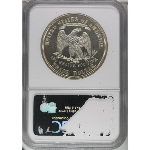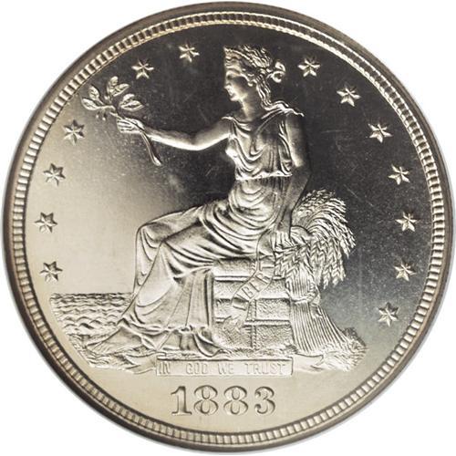 <B>1883 T$1 PR67 Cameo NGC.</B></I> A fully brilliant Superb Gem with exceptional aesthetic appeal. Both sides exhibit fully brilliant silver surfaces that are accented by faint gold color that follows the obverse and reverse borders. From 1878 to 1883 (and on to 1885) trade dollars were only coined in proof format, and survivors are not particularly rare, although those at the highest grade levels are not easy to locate. The mintage in 1883 was just 979 coins with possibly 500 to 600 surviving today, nearly all in lower numerical grades, and many that actually show signs of wear. This example is an impressive exception to the rule, perhaps one of the finest known examples. Census: 12 in 67, 0 finer (3/07).<BR><BR><b>Shipping:</b> Coins & Currency (<a target="_blank" href="http://www.heritageauctions.com/common/shipping.php">view shipping information</a>)