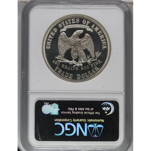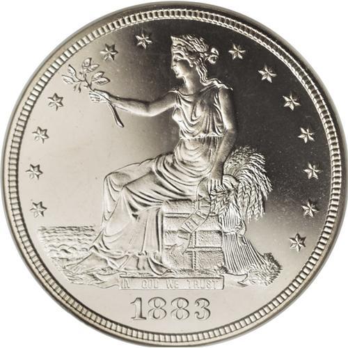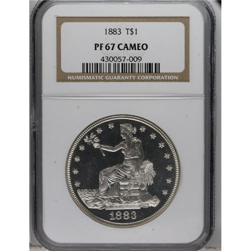 <B>1883 T$1 PR67 Cameo PCGS.</B></I> Although this Superb proof is designated as a Cameo, it is on the verge of qualifying as an Ultra Cameo proof specimen. Both sides are fully brilliant with bright silver surfaces and no evidence of toning. The fields are deeply mirrored and surround highly lustrous devices on both sides. All of the design elements are completely defined, including Liberty's head, the stars, and all of the eagle's feather details. The present sale has two essentially identical 1883 proof trade dollars, each certified by NGC as PR67 Cameo. Census: 12 in 67, 0 finer (3/07).<BR><BR><b>Shipping:</b> Coins & Currency (<a target="_blank" href="http://www.heritageauctions.com/common/shipping.php">view shipping information</a>)