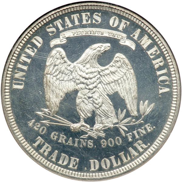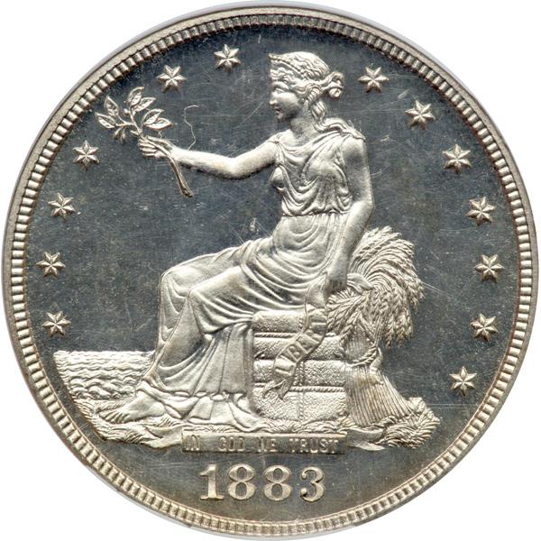 1883 Trade Dollar. NGC graded Proof 66 Cameo. A glittering untoned Gem Proof with deep cameo contrast. Only 979 Proofs issued for this proof-only date. The very definition of a cameo Proof Trade Dollar, being satiny through the centers and on all stars and legends against silvery deep-mirrored fields. Rated on its technical merits, this piece is surely among the finest survivors, and in terms of eye appeal, this 1883 is simply breathtaking. Pop 18; 12 in 67 Cameo.