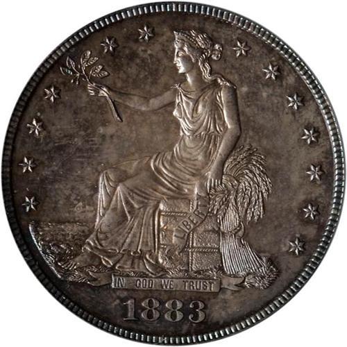 <b>1883 Trade Dollar. PCGS graded Proof 63.</b> Medium gray with blue toning that is most iridescent on the reverse. Attractive and uncleaned, yet basically very choice in appearance. The few wispy hairline do not detract from the overall pleasing eye appeal of this Proof 63 <b>(PCGS # 7063)</b> <i>
