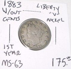 1883 W/OUT CENTS *1ST YEAR* LIBERTY "V" NICKEL *RARE MS-63 HIGH GRADE* RED BOOK VALUE IS $175.00+!! COIN CAME OUT OF SAFE!! ***Coin, Currency & All Items Listed in this auction - Grades, Conditions and Values are not Safe Deposit Coins LLC Responsibilty. Grades, Condition and Values are determined by Consigner(s) & Buyers ONLY