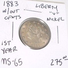 1883 W/OUT CENTS *1ST YEAR* LIBERTY "V" NICKEL *EXTREMELY RARE MS-65 HIGH GRADE* RED BOOK VALUE IS $275.00+!! COIN CAME OUT OF SAFE!! ***Coin, Currency & All Items Listed in this auction - Grades, Conditions and Values are not Safe Deposit Coins LLC Responsibilty. Grades, Condition and Values are determined by Consigner(s) & Buyers ONLY