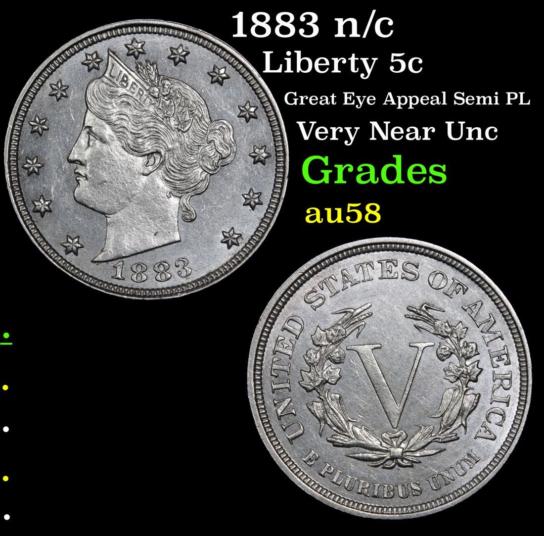 1883 n/c Great Eye Appeal Semi PL Very Near Unc Liberty Nickel 5c Grades Choice AU/BU Slider.