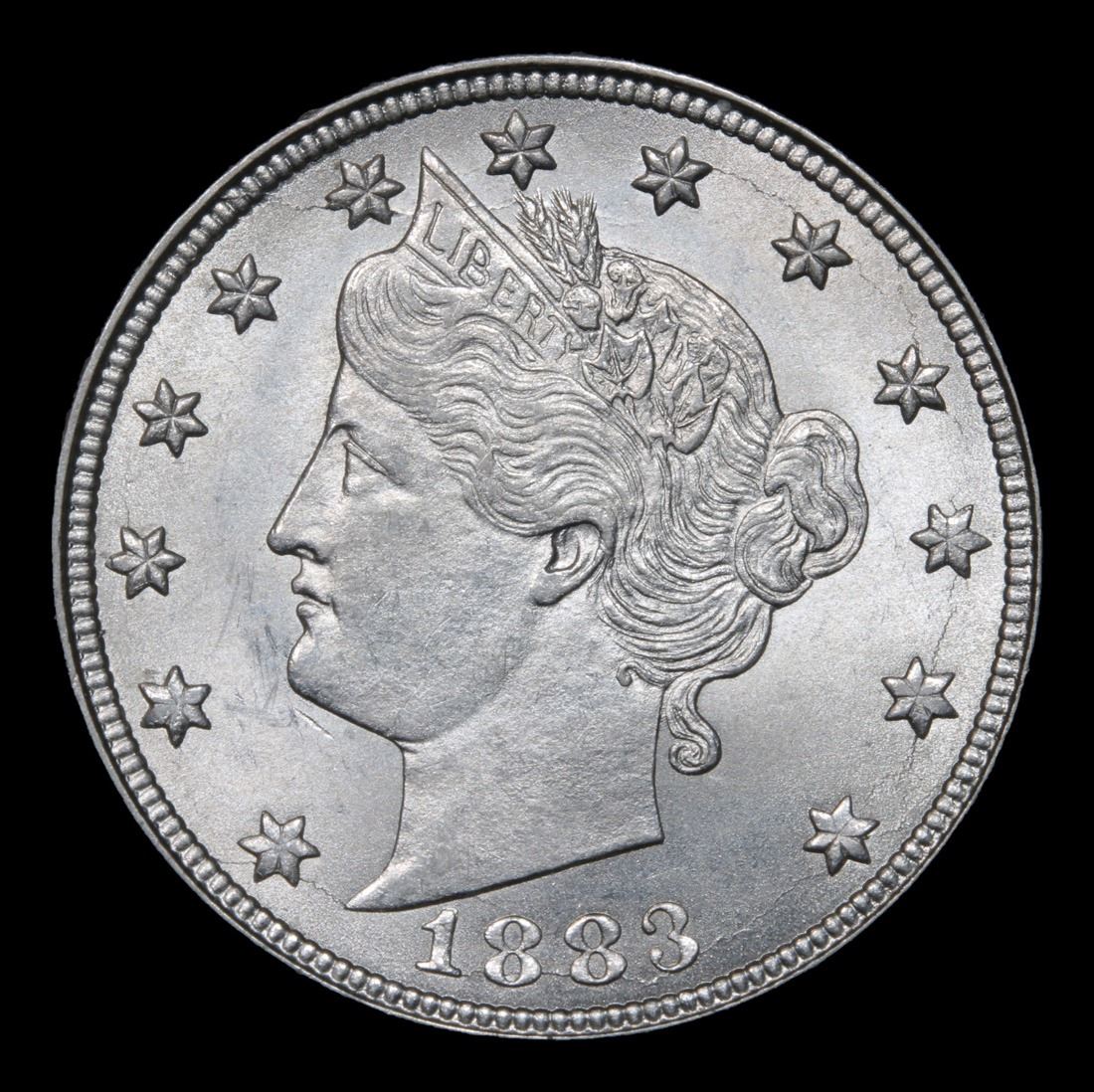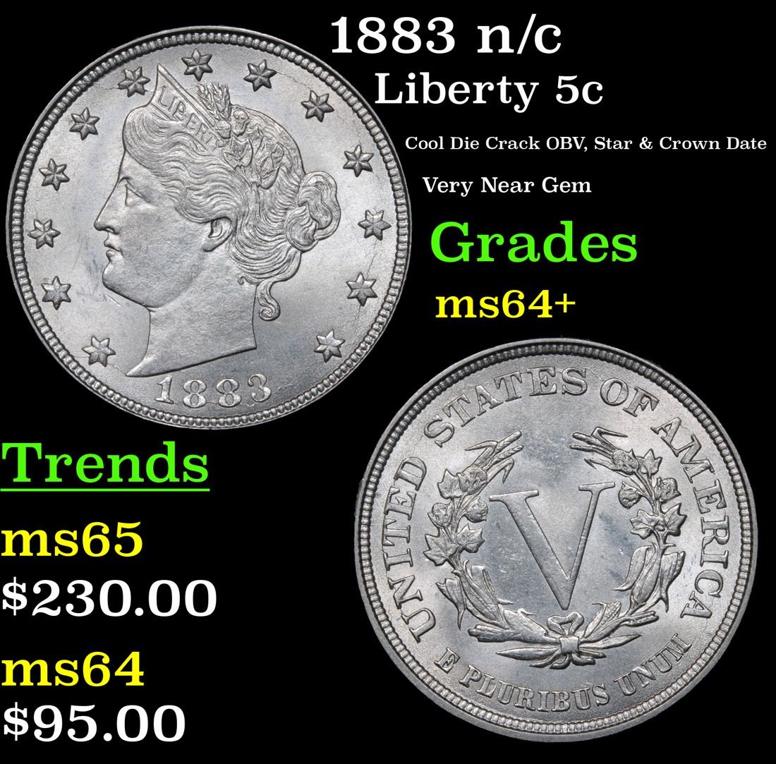 1883 n/c Cool Die Crack OBV, Star & Crown Date Very Near Gem Liberty Nickel 5c Grades Choice+ Unc.