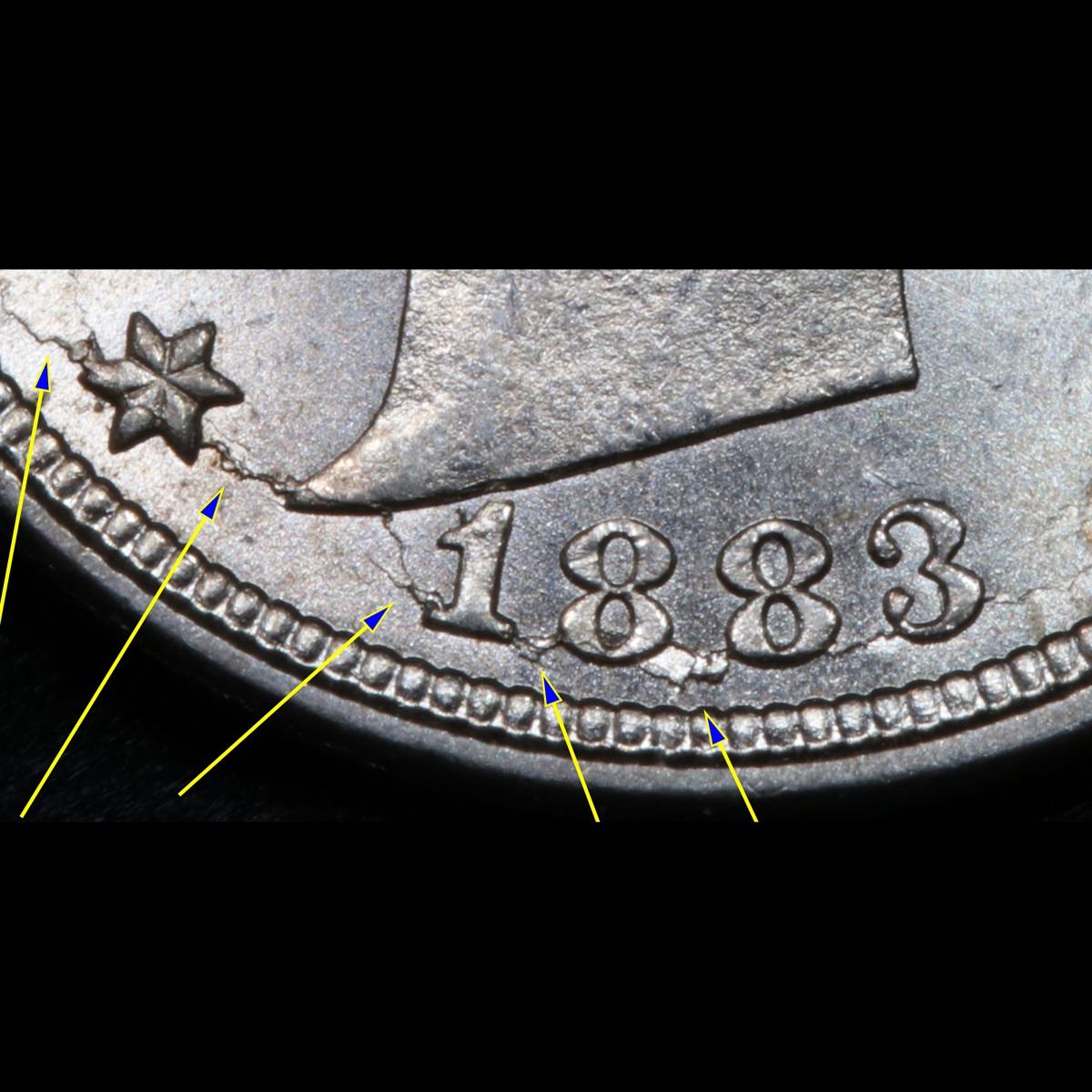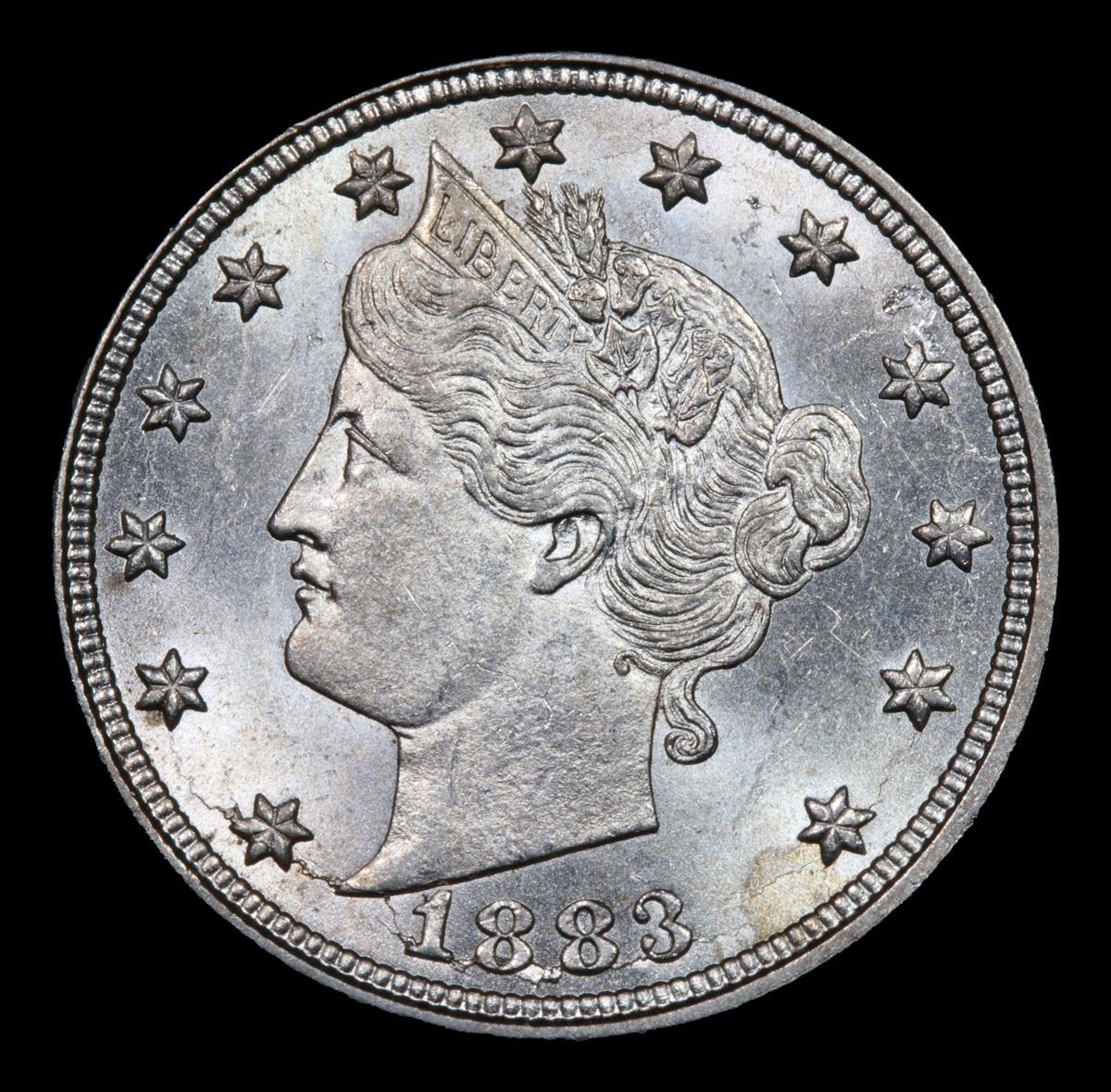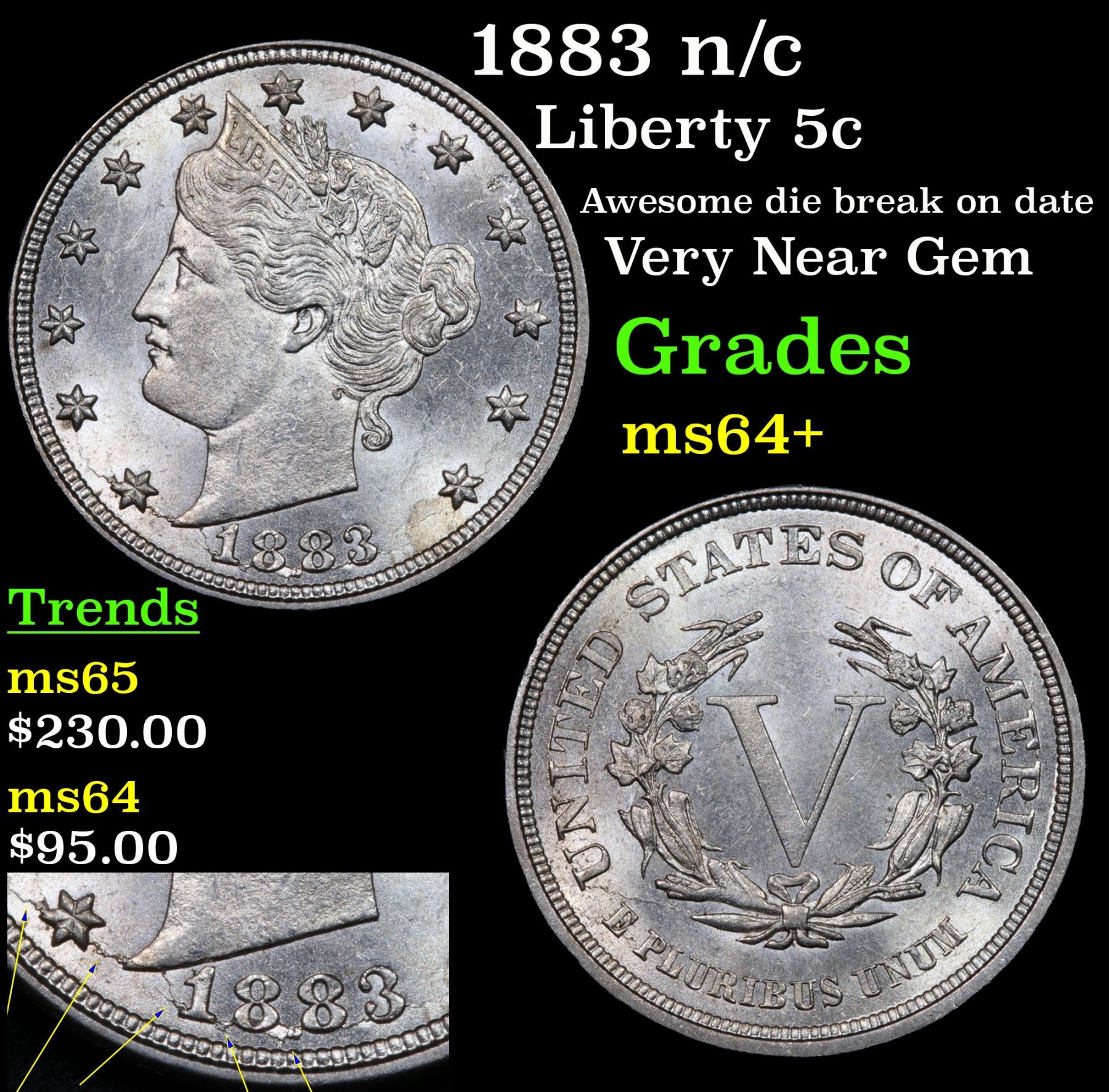 1883 n/c Awesome die break on date Very Near Gem Liberty Nickel 5c Grades Choice+ Unc.
