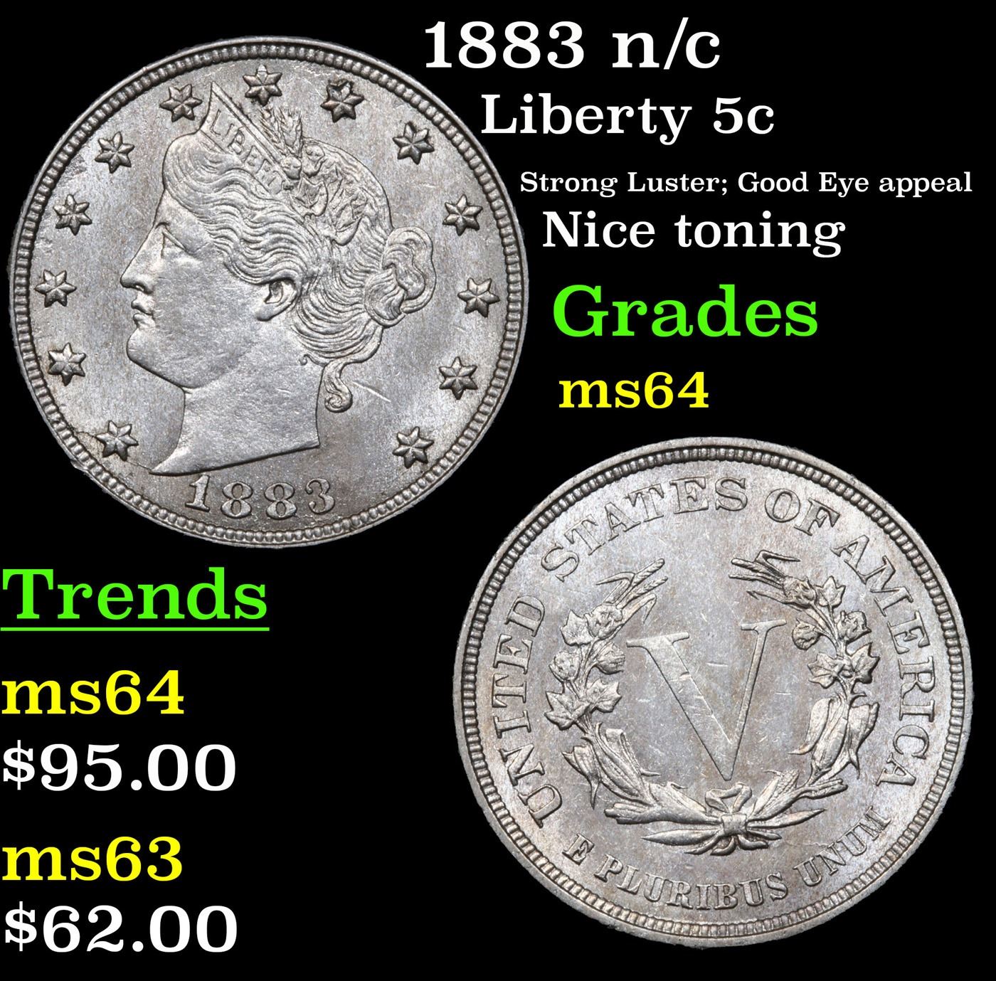 1883 n/c Liberty Nickel 5c Grades Choice Unc.