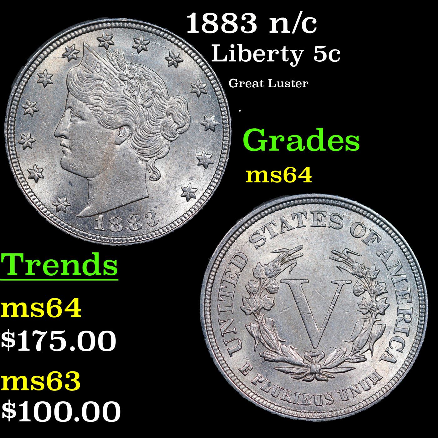 1883 n/c Liberty Nickel 5c Grades Choice Unc.
