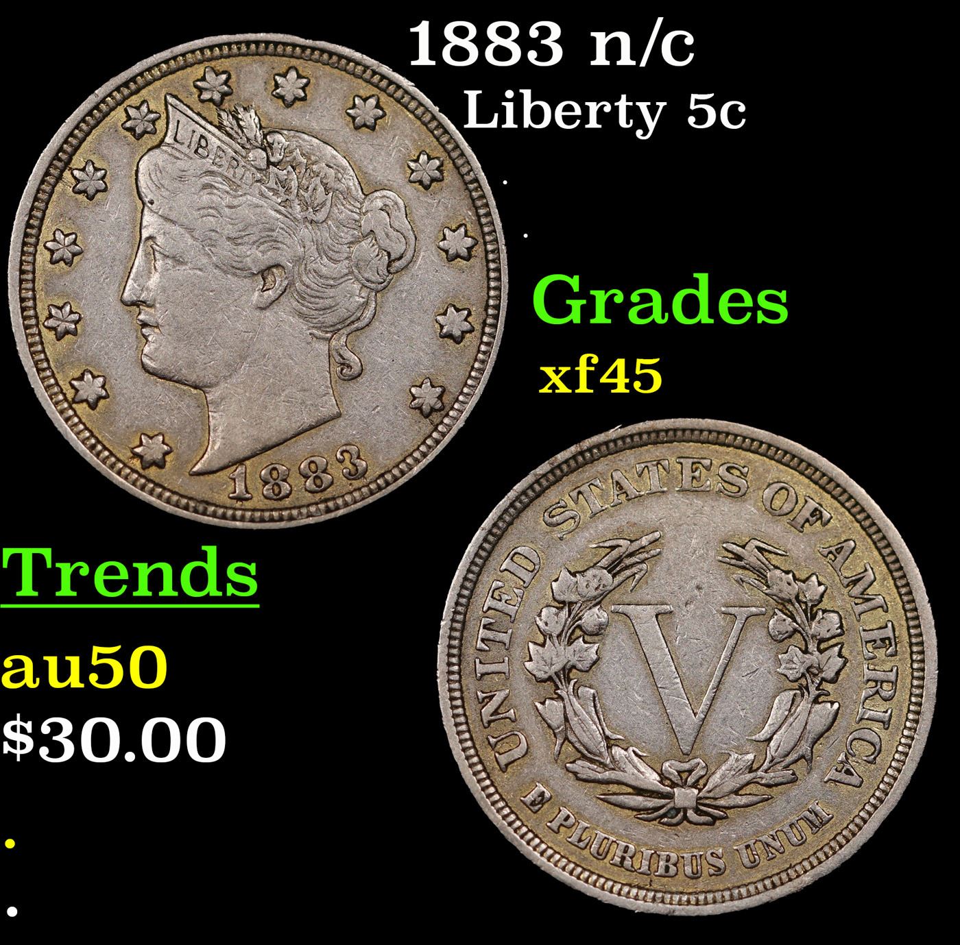 1883 n/c Liberty Nickel 5c Grades xf+.
