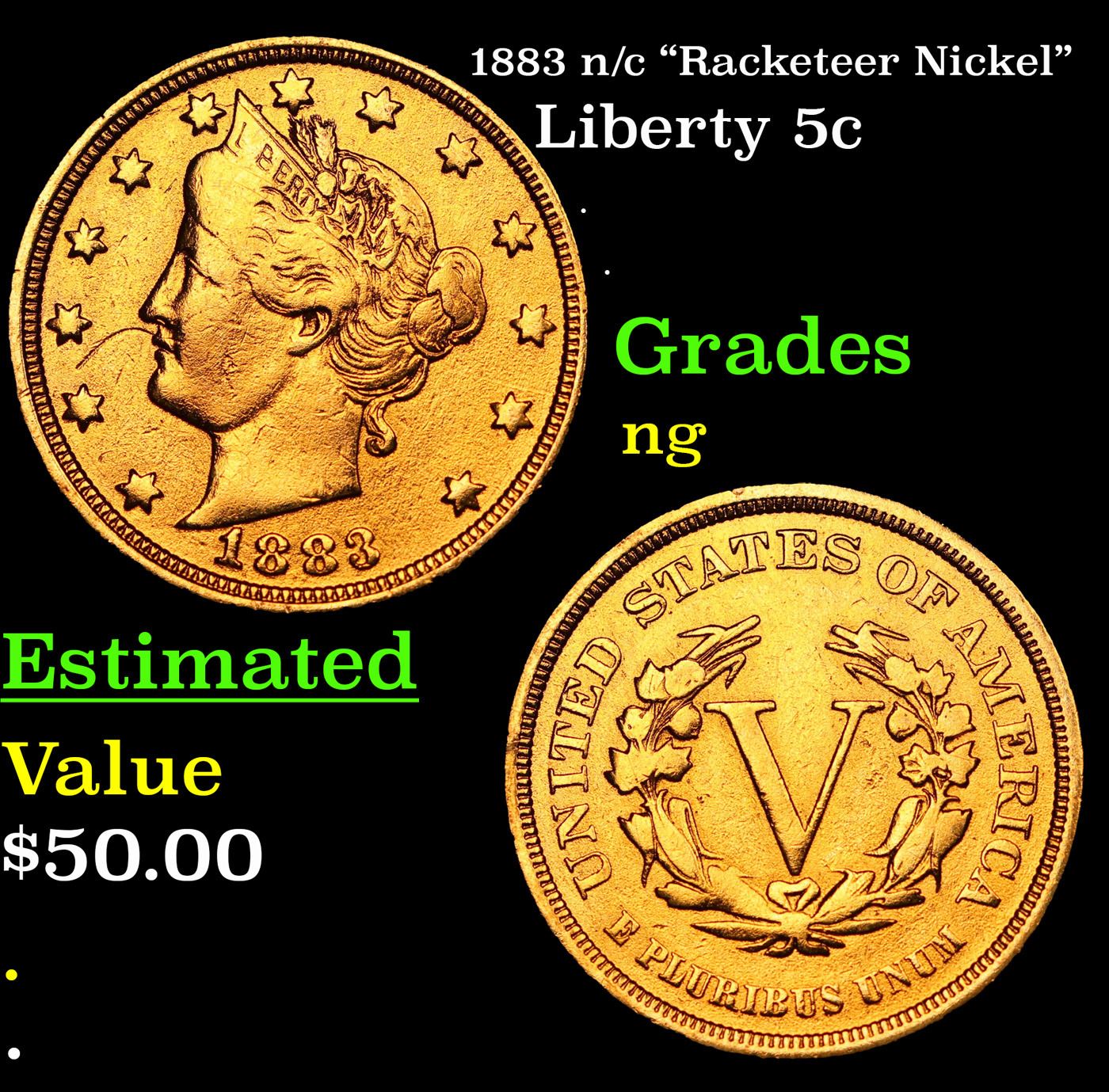 1883 n/c "Racketeer Nickel" Liberty Nickel 5c Grades. The racketeer nickel is one of the most infamous coins of all time. It was developed by unscrupulous opportunists after the U.S. mint issued the Liberty nickel in 1883. On one side it had the head of Liberty. On the obverse, it simply had the Roman numeral V and nowhere did it spell out its value as 5 cents. As it so happened, the nickel was close in size to the $5 gold piece, which had a similar design. Thus, many 1883 "no cents" nickels were gold plated and often successfully passed off as $5 gold coins in the first year of their issue. Due to this, the mint added the word "cents" the following year.