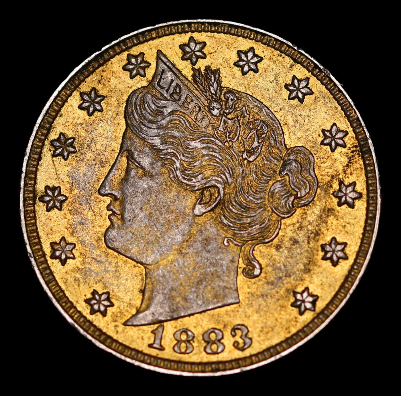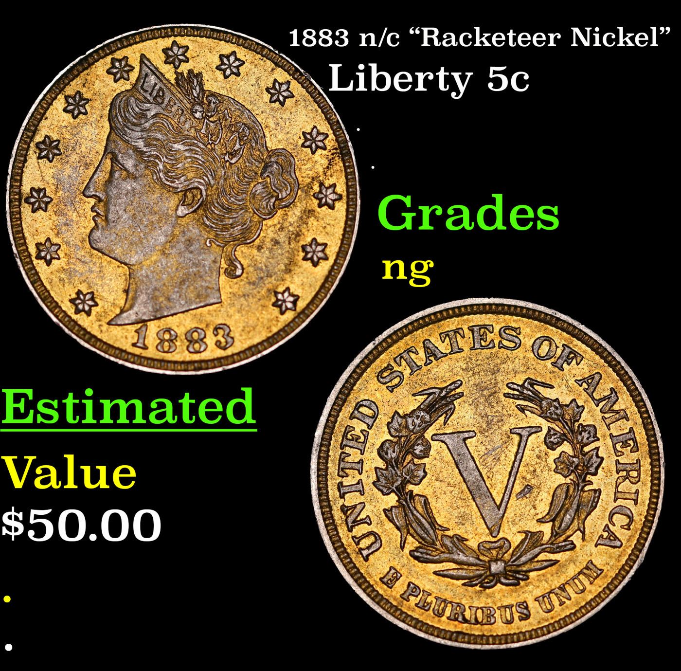 1883 n/c "Racketeer Nickel" Liberty Nickel 5c Grades. The racketeer nickel is one of the most infamous coins of all time. It was developed by unscrupulous opportunists after the U.S. mint issued the Liberty nickel in 1883. On one side it had the head of Liberty. On the obverse, it simply had the Roman numeral V and nowhere did it spell out its value as 5 cents. As it so happened, the nickel was close in size to the $5 gold piece, which had a similar design. Thus, many 1883 "no cents" nickels were gold plated and often successfully passed off as $5 gold coins in the first year of their issue. Due to this, the mint added the word "cents" the following year.