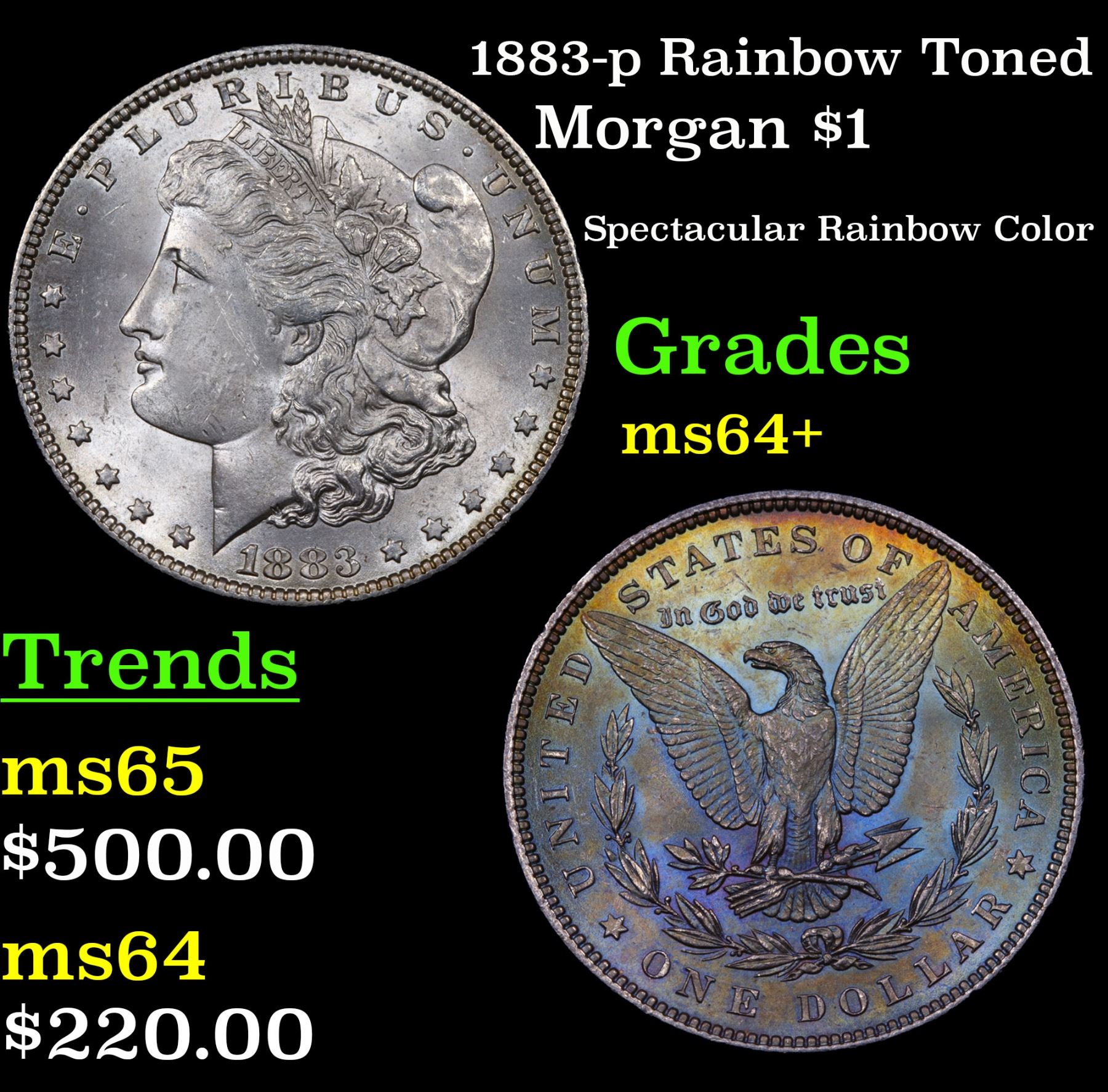 1883-p Rainbow Toned Morgan Dollar $1 Grades Choice+ Unc.
