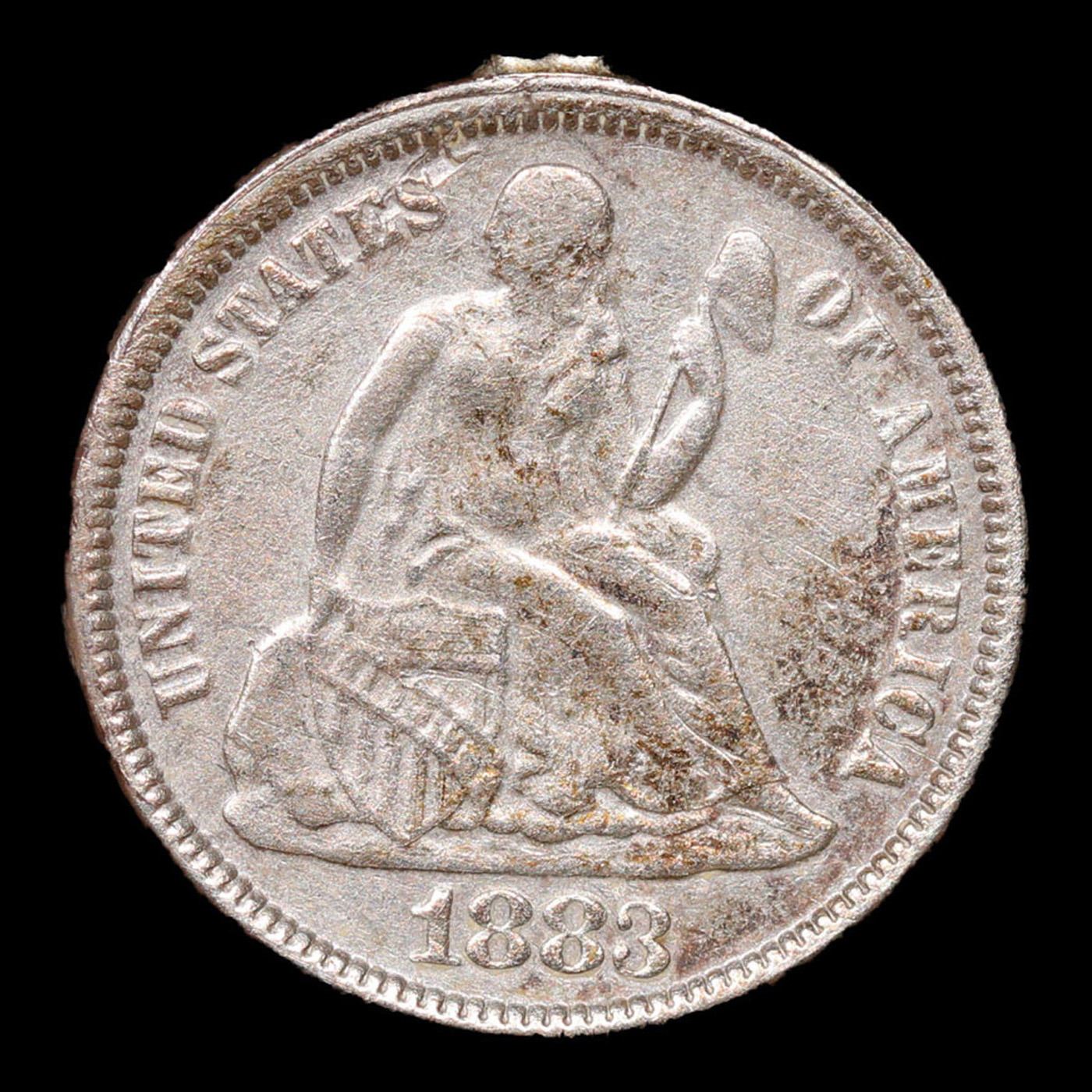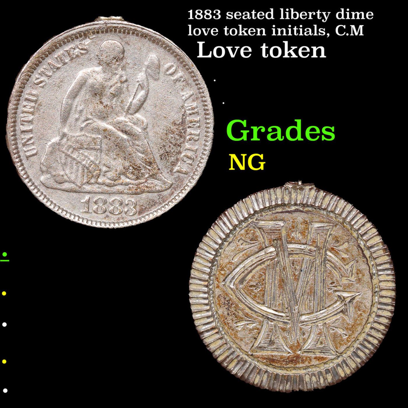 1883 seated liberty dime love token initials, C.M Grades NG. Love tokens are coins that were engraved after the minting process was complete. Generally, an artisan removed the words and images from the reverse, or sometimes from both the obverse and the reverse of a coin. Artisans ranging in skills from a high-quality craftsperson to a "do-it-yourselfer" then engraved or punched pictures, initials, and messages on the cleared area.Other times, the coin was left intact and the artisan engraved initials, dates, or pictures on the edges around the images of liberty or royalty. The coins became lucky charms, objects of art, and pieces of jewelry. The messages on the coins could be used as spiritual reminders, family documentation, or sentimental sweet nothings.It is believed that the love token originated in Great Britain as early as the 13th century with the practice of bending coins. When dealing with your favorite saint, in return for a favor, a coin was bent and a pledge was made. The bent coin, "a token of your pledge," became a physical reminder of your obligation.