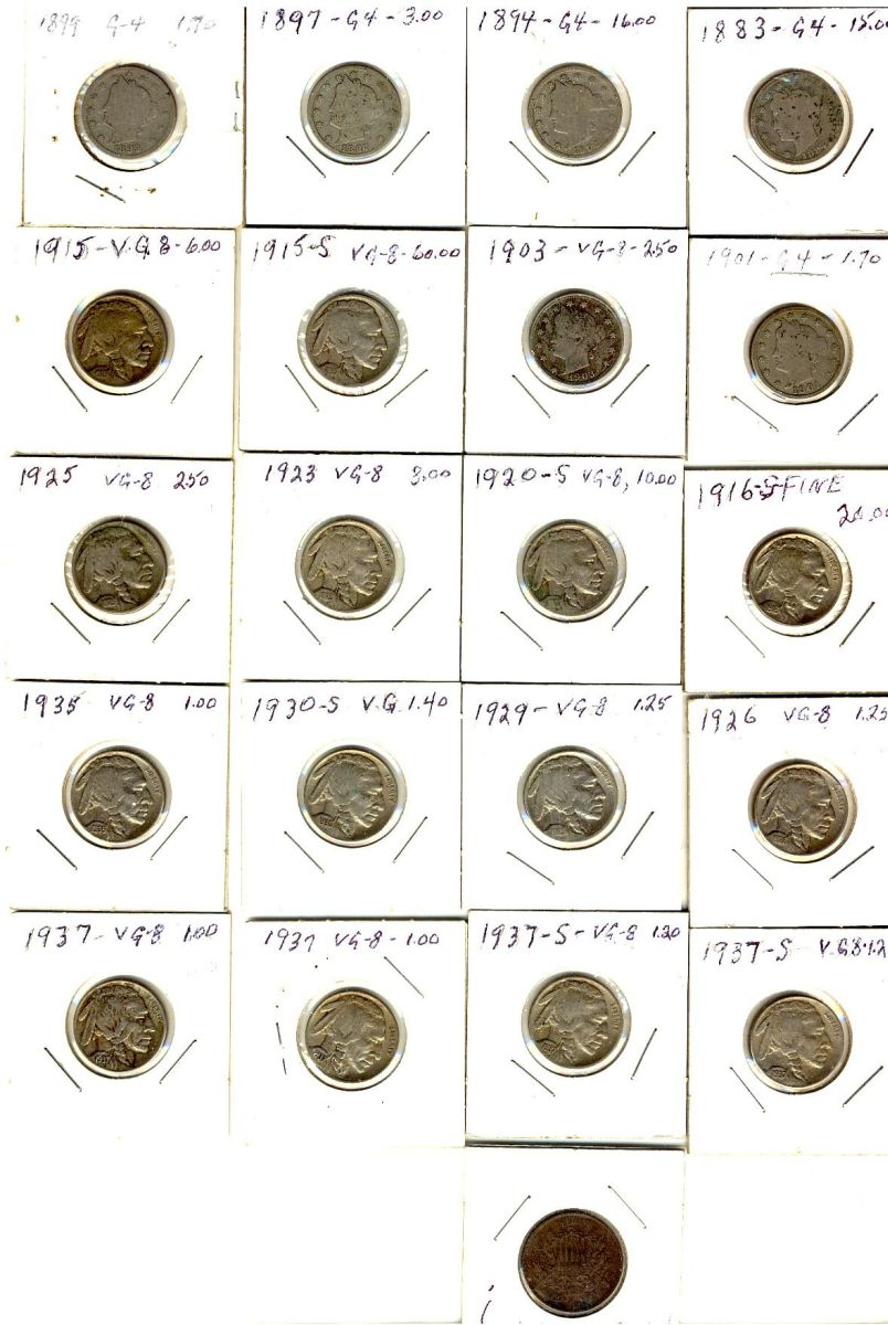 1883 to 1937 5¢. Small lot of 21 coins. Includes 1883, 1894, 1897, 1899, 1901, 1903, 1915S, 1915,