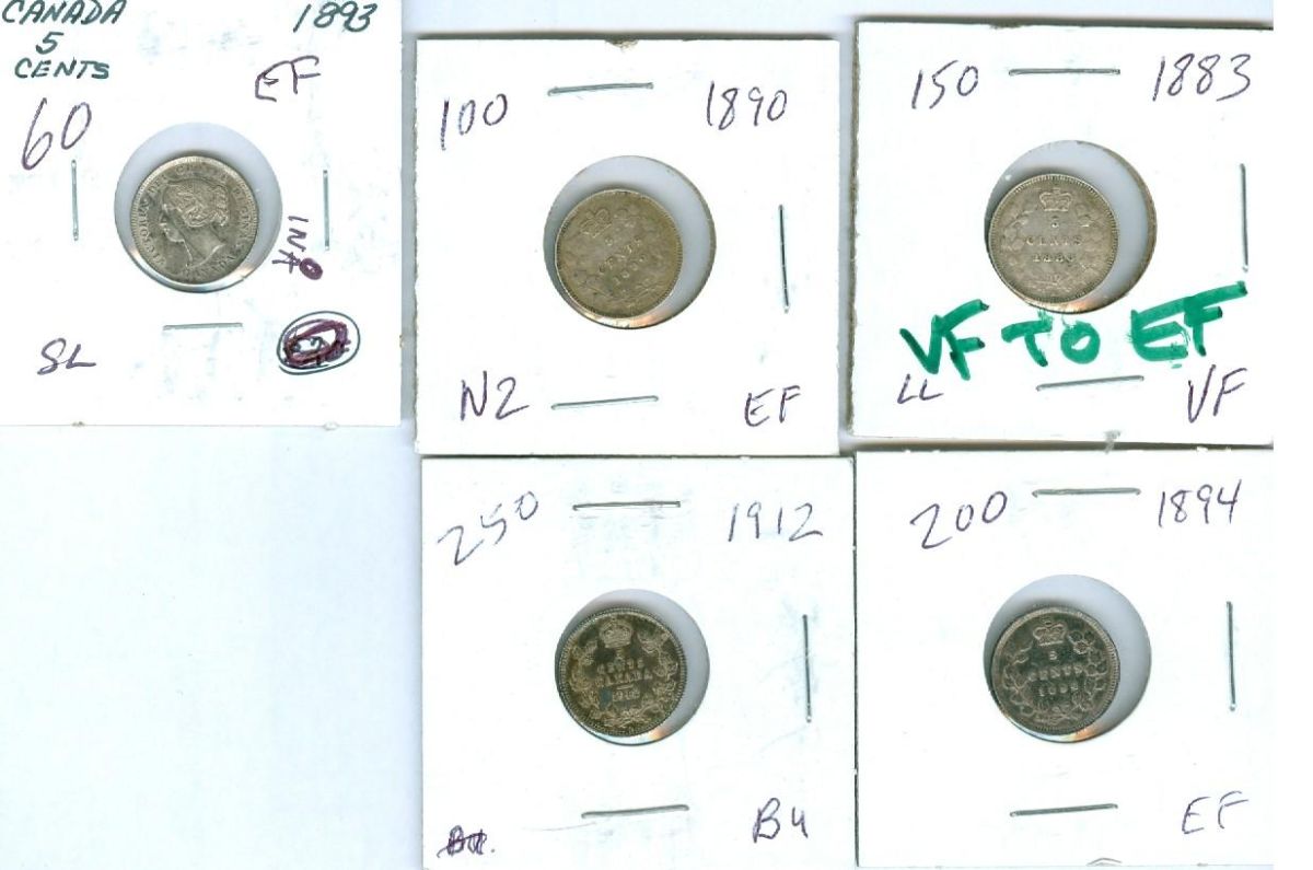 1883H, 1890H, 1893, 1894 & 1912 5¢. Lot of 5 coins. VF to EF. Should be viewed.