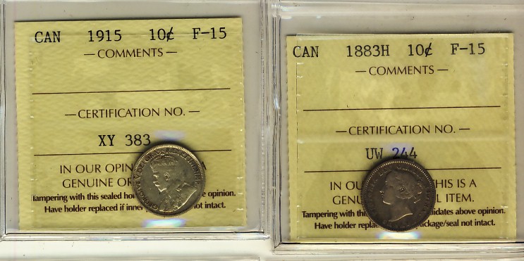 1883H & 1915 10¢ ICCS F15. Lot of 2 coins.