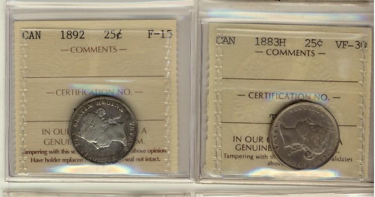 1883H 25¢ VF30 & 1892 F15. Lot of 2 ICCS graded coins.