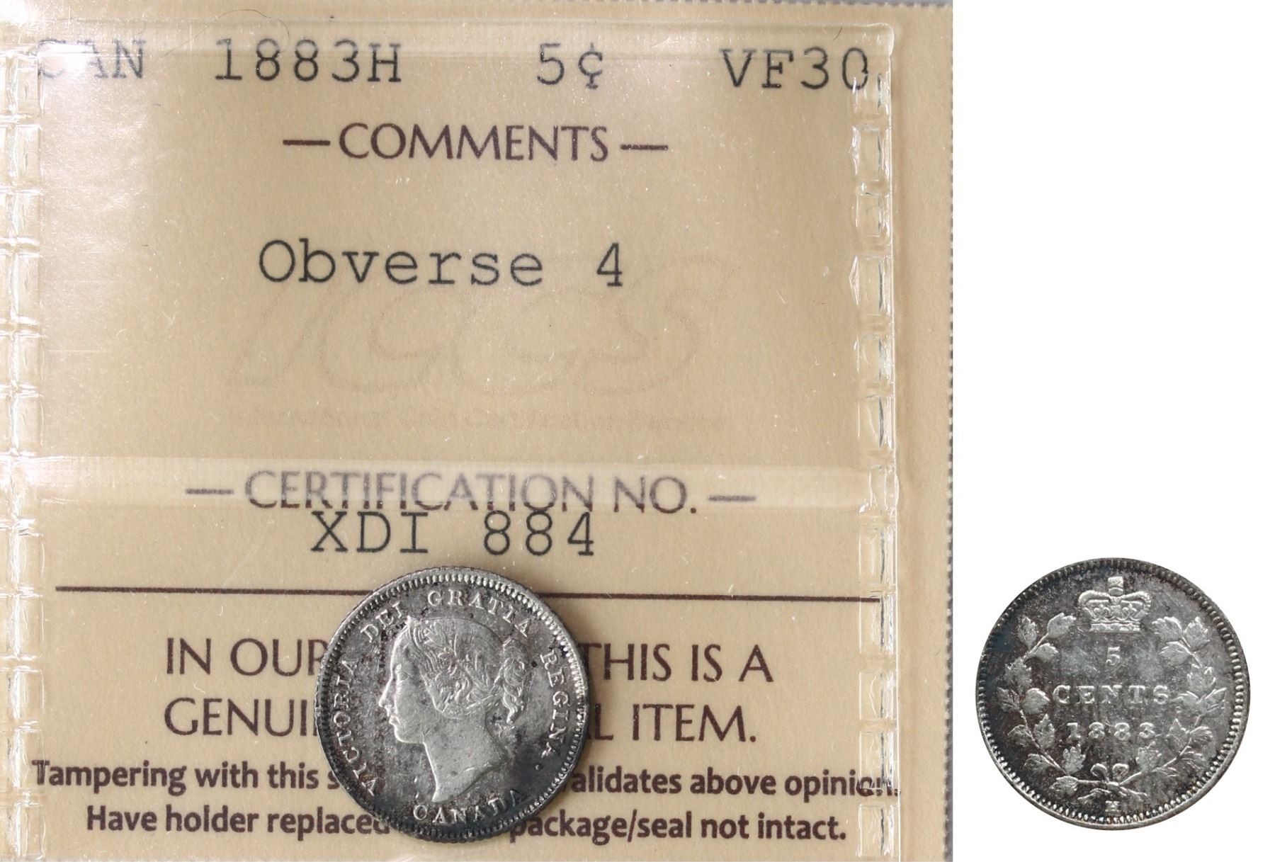 1883H 5¢ "Obv.4" ICCS Choice Very Fine-30. Scarce obverse type.