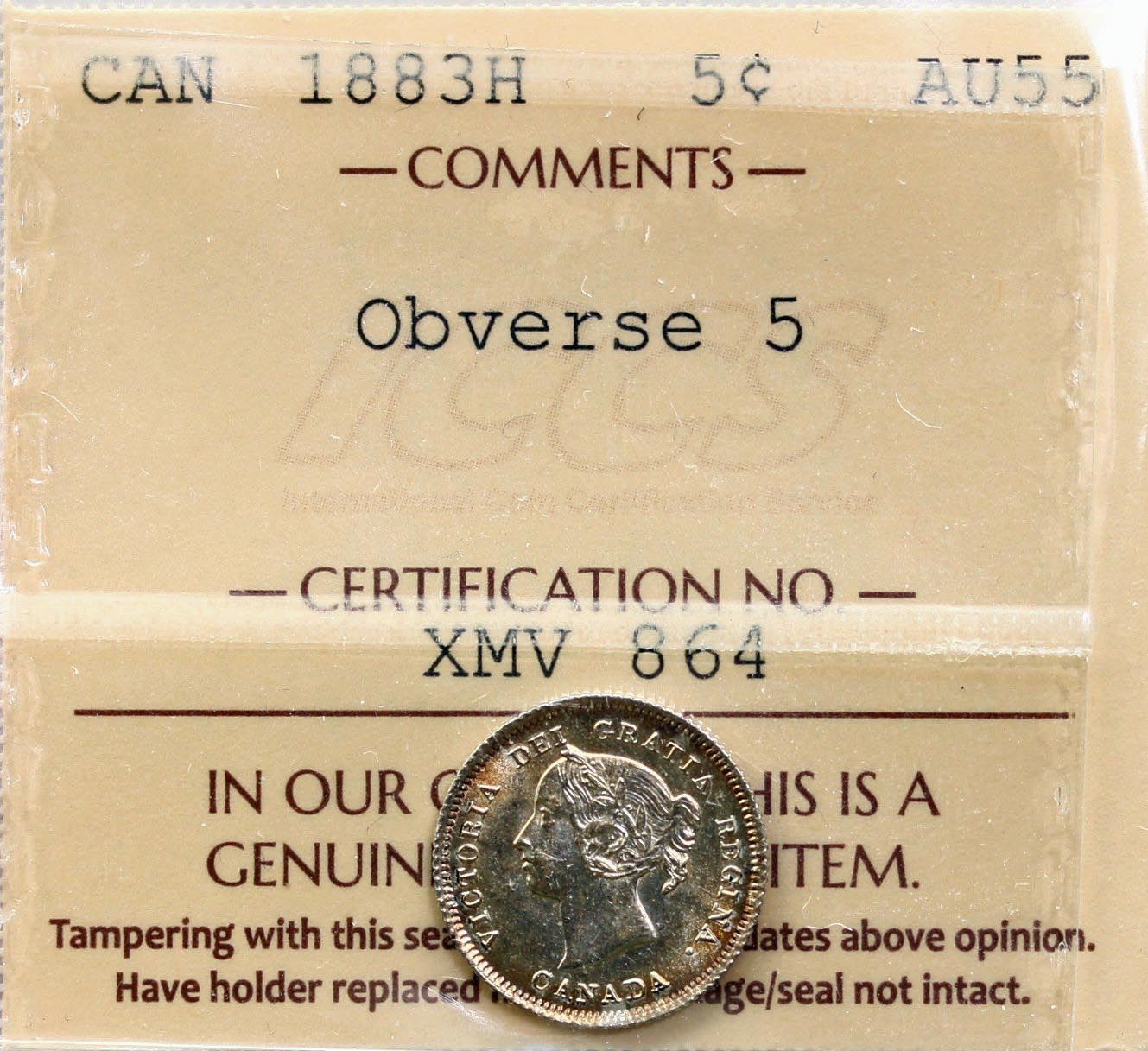 1883H 5¢ Obv 5 ICCS Choice About Uncirculated-55. Bright and lustrous issue for grade.
