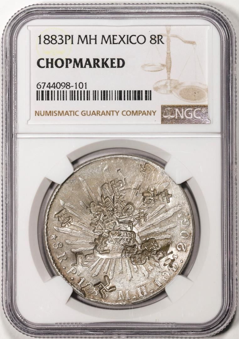 One 1883PI MH Mexico 8 Reales Silver Coin NGC Chopmarked. NGC Certified.
