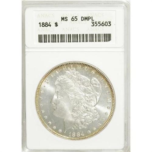 <B>1884 $1 MS65 Deep Mirror Prooflike ANACS.</B></I> This attractive Gem offers flashy fields and crisply struck devices. Light golden-brown toning fills the peripheries, along with glimpses of orange and powder-blue.<BR><BR><b>Shipping:</b> Coins & Currency (<a target="_blank" href="http://www.heritageauctions.com/common/shipping.php">view shipping information</a>)