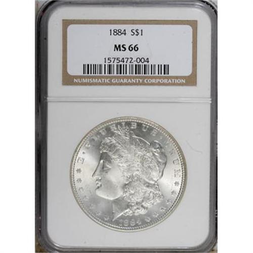 <B>1884 $1 MS66 NGC.</B></I> NGC Census: (275/33). PCGS Population (336/29). Mintage: 14,070,875. Numismedia Wsl. Price for NGC/PCGS coin in MS66: $660. (#7150)<BR><BR><B>Coin Engraver:</B> George T. Morgan<BR><BR><b>Shipping:</b> Coins & Currency (<a target="_blank" href="http://www.heritageauctions.com/common/shipping.php">view shipping information</a>)