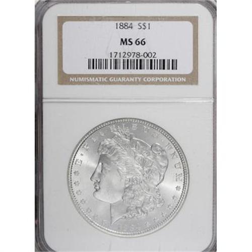 <B>1884 $1 MS66 NGC.</B></I> . NGC Census: (282/34). PCGS Population (344/29). Mintage: 14,070,875. Numismedia Wsl. Price for NGC/PCGS coin in MS66: $660. (#7150)<BR><BR><B>Coin Engraver:</B> George T. Morgan<BR><BR><b>Shipping:</b> Coins & Currency (<a target="_blank" href="http://www.heritageauctions.com/common/shipping.php">view shipping information</a>)