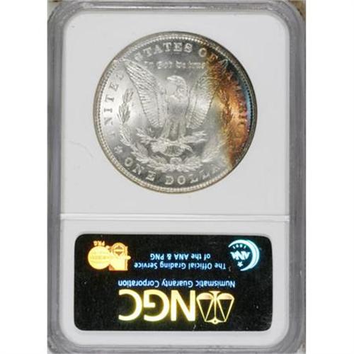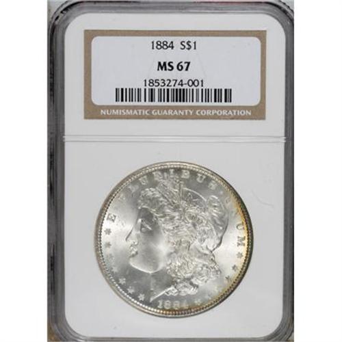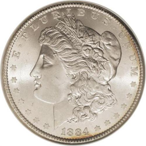 <B>1884 $1 MS67 NGC.</B></I> A narrow ribbon of golden-tan toning hugs the right and lower obverse rim, while arcs of original cobalt-blue, lavender, and golden-tan are positioned along the right reverse border. The remaining areas are brilliant. Well preserved surfaces exhibit cartwheel luster and exquisitely defined motifs. Census: 31 in 67, 2 finer (5/07).<BR><BR><b>Shipping:</b> Coins & Currency (<a target="_blank" href="http://www.heritageauctions.com/common/shipping.php">view shipping information</a>)