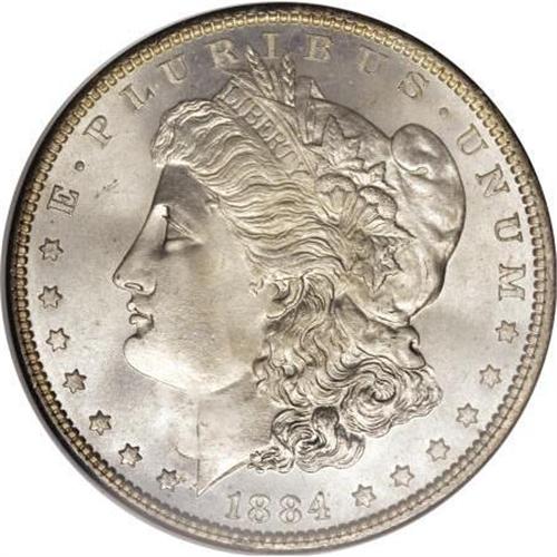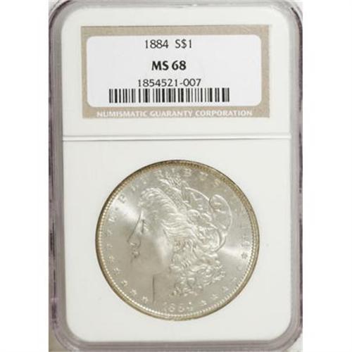 <B>1884 $1 MS68 NGC.</B></I> The 1884 Morgan dollar, with its mintage of more than 14 million circulation strikes, is a common issue, with even Mint State coins plentiful. This becomes apparent after a perusal of the population figures. NGC and PCGS have certified about 19,000 examples in grades MS60 through MS65. Approximately 600 Premium Gems have been seen, and nearly 60 MS67s. In MS68, however, the services have graded just three examples (two NGC and one PCGS), and none finer (7/07).<BR> Dazzling luster adorns both sides of this beautiful MS68 coin, and whispers of tan-gold color concentrate at the rims, leaving the remaining surfaces color free. A well executed strike leaves its mark on all of the design features, and there are no marks worthy of mention. An inoffensive graze in the left obverse field and another in the left reverse field aid in identifying this particular coin.<BR><BR><B>Coin Engraver:</B> George T. Morgan<BR><BR><b>Shipping:</b> Coins & Currency (<a target="_blank" href="http://www.heritageauctions.com/common/shipping.php">view shipping information</a>\)