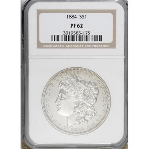 <B>1884 $1 PR62 NGC.</B></I> Myriad hairlines somewhat diminish the reflectivity of the fields, but there are no offensive contact marks and the strike is very bold. The color is an even steel-gray and rotation reveals a hint of cameo contrast.<BR><BR><B>Coin Engraver:</B> George T. Morgan<BR><BR><b>Shipping:</b> Coins & Currency (<a target="_blank" href="http://www.heritageauctions.com/common/shipping.php">view shipping information</a>)